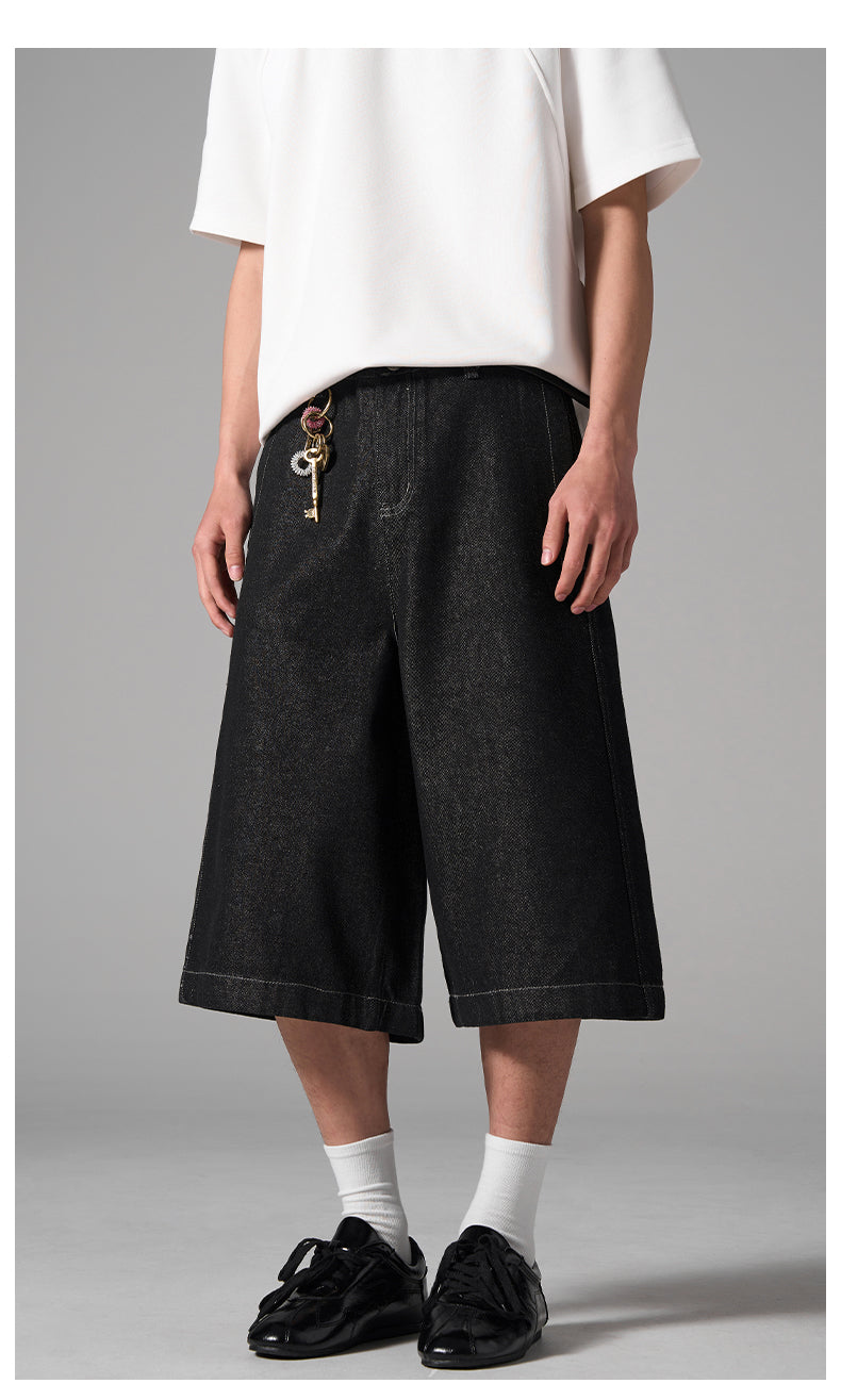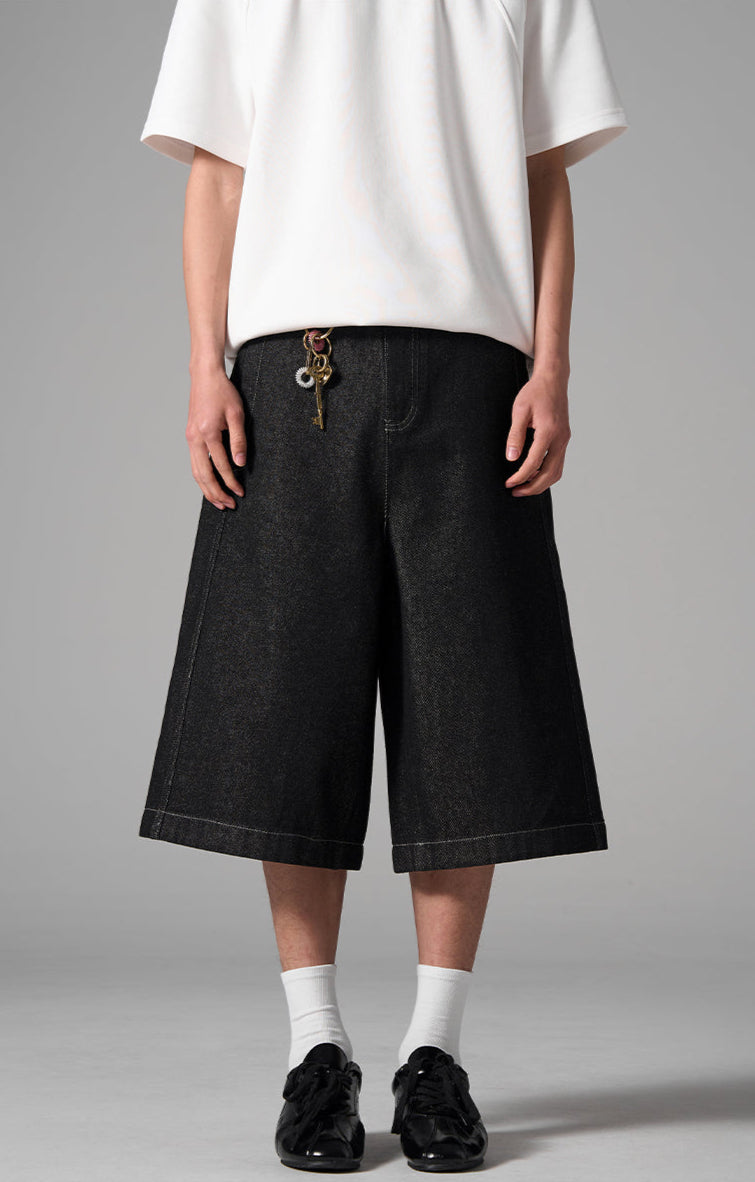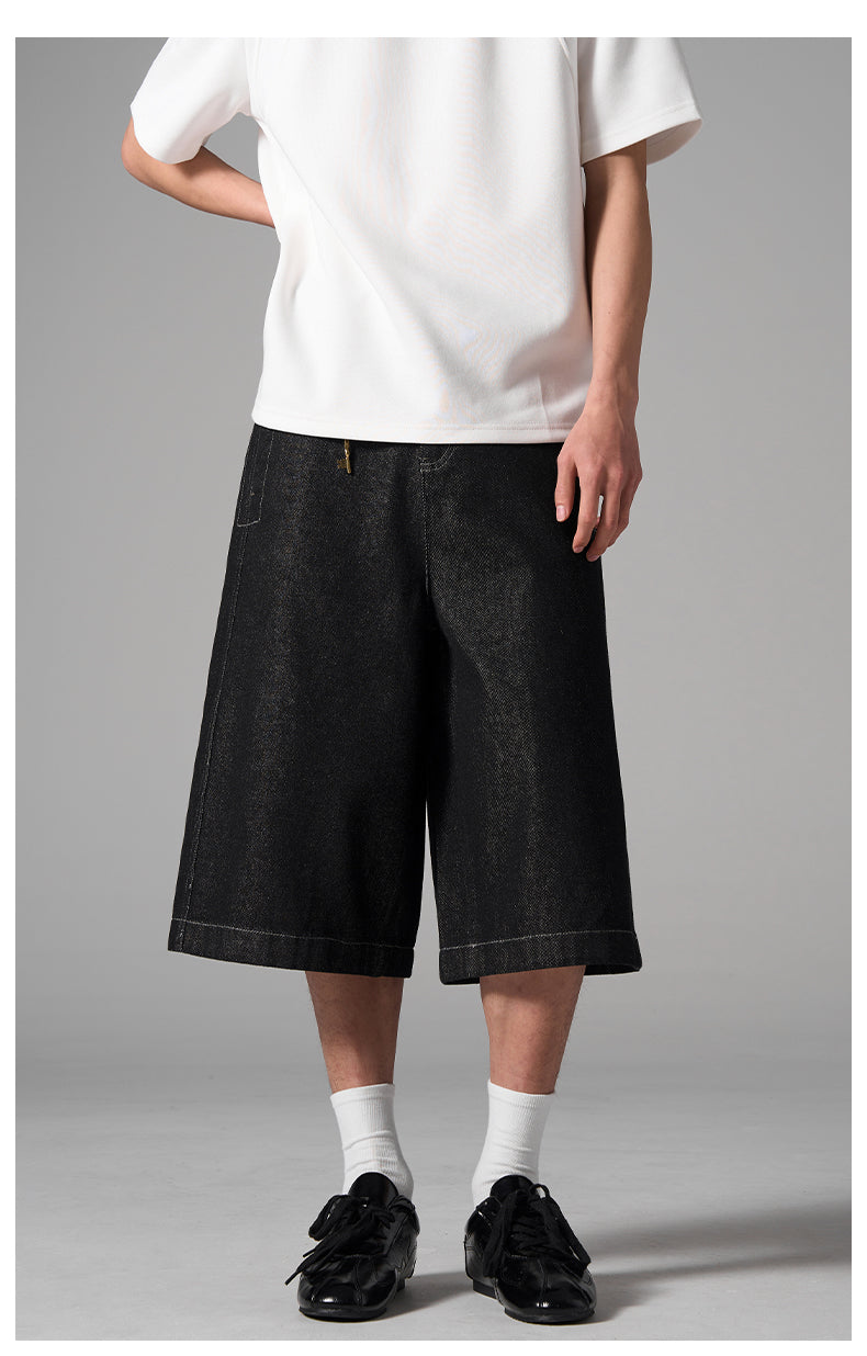 A modern silhouette meets utilitarian rawness in these structured wide-leg denim shorts. Featuring a heavyweight drape with subtle texture and reinforced panel design, these shorts offer a refined take on streetwear. The cropped length and wide hem create a bold profile while maintaining all-day comfort.